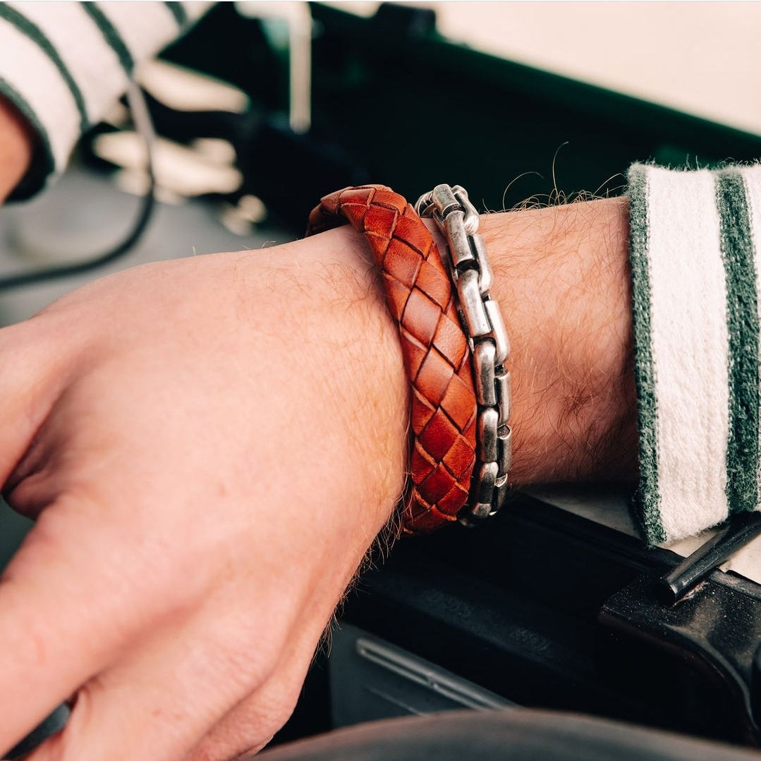 The iXXXi MEN bracelet Jesse is a handmade leather bracelet. The bracelet consists of two rows of narrow, cognac-colored leather straps that are braided together in a kind of 'folded' design. Bracelet Jesse has an elongated, matte silver-colored clasp made of stainless steel. The iXXXi men's bracelet Jesse is available in sizes 19, 20 and 21. Mix and match with different bracelets from the iXXXi MEN collection to complete your look!