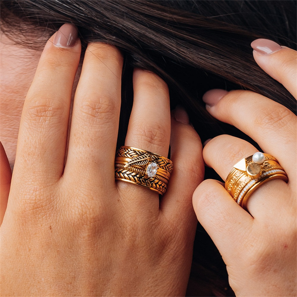 The iXXXi filling ring Symbol Feather is a 2mm wide filling ring made of stainless steel and has a gold-colored plating. The filling ring is a smooth ring that has a symbol in the shape of a feather at the top. The feather has a size of 10 millimeters x 8 millimeters (length x width). The gold fill ring Symbol Feather is available in sizes 17 to 21 and in the colors rose gold and silver. Add this symbol to your ring combination and it will immediately get a 'bohemian' look.